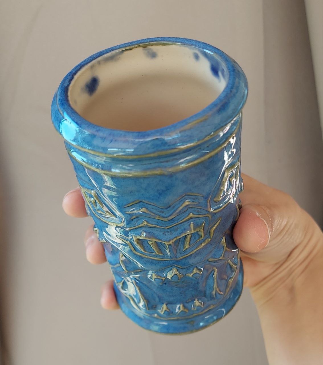 Midrange clay, blue glaze outside. Holds Approx. 10 oz. Dishwasher safe.