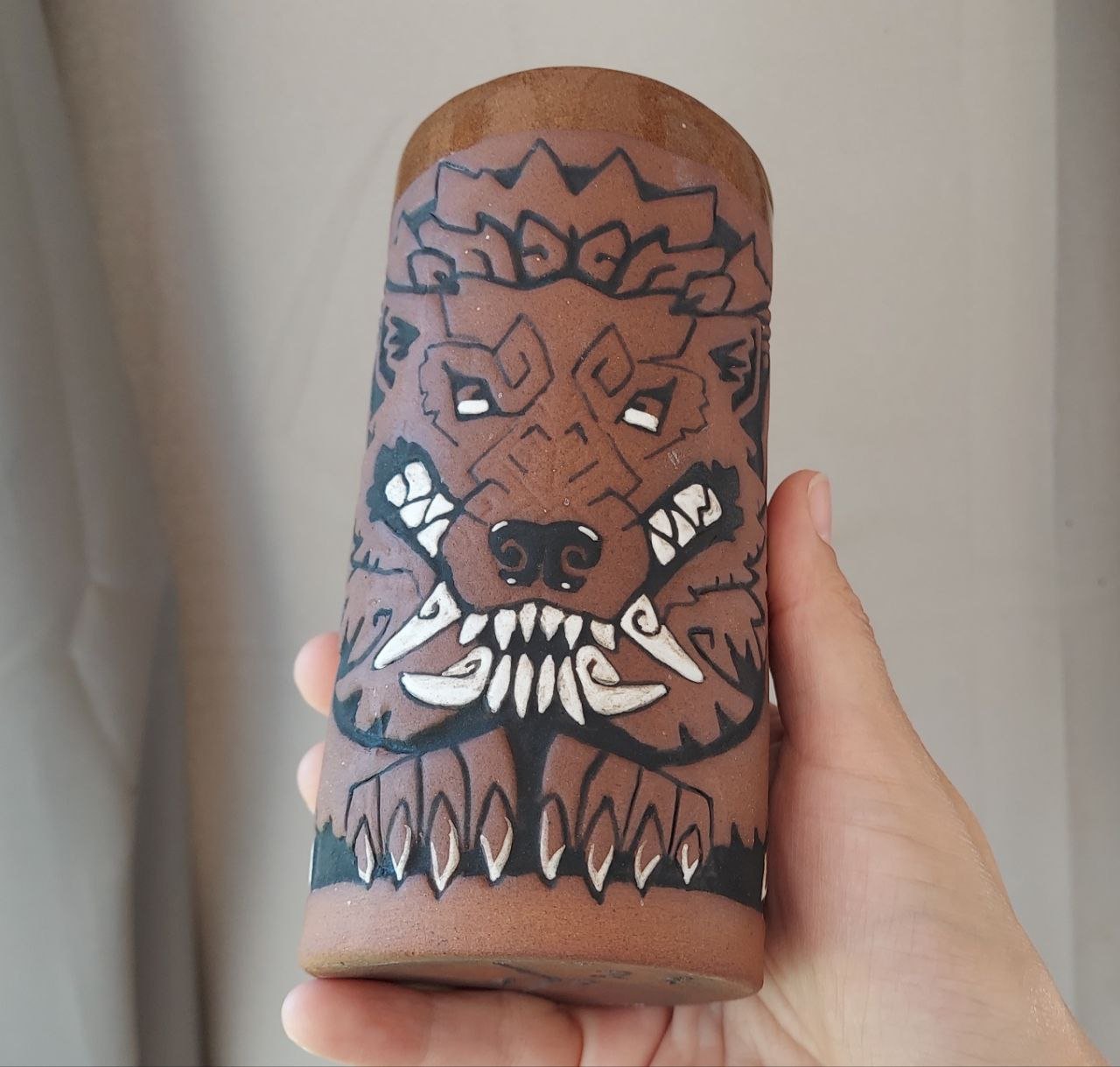 When a digital artist collabs with a potter, you get a wolf tiki! Each slip cast mug is a unique work of art that you can use. Art design by @mongrelist